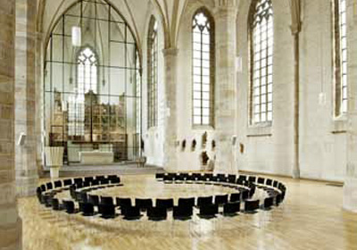 14. Jhs. betritt, ist überrascht von ihrer Helligkeit und Weite. Tageslicht fällt ungebrochen durch die weißen Fenster. Ein Raum von Bänken befreit, der den Blick nach oben zieht, in das gotische Gewölbe. Sein wertvolles Schmuckstück ist der goldene flandrische Flügelaltar im Chorraum. Der lichtdurchflutete, weite und ansonsten nur spärlich ausgestattete Innenraum hat auch durch seine flexible Bestuhlung und seine monumentale Glaswand eine moderne Anmutung.